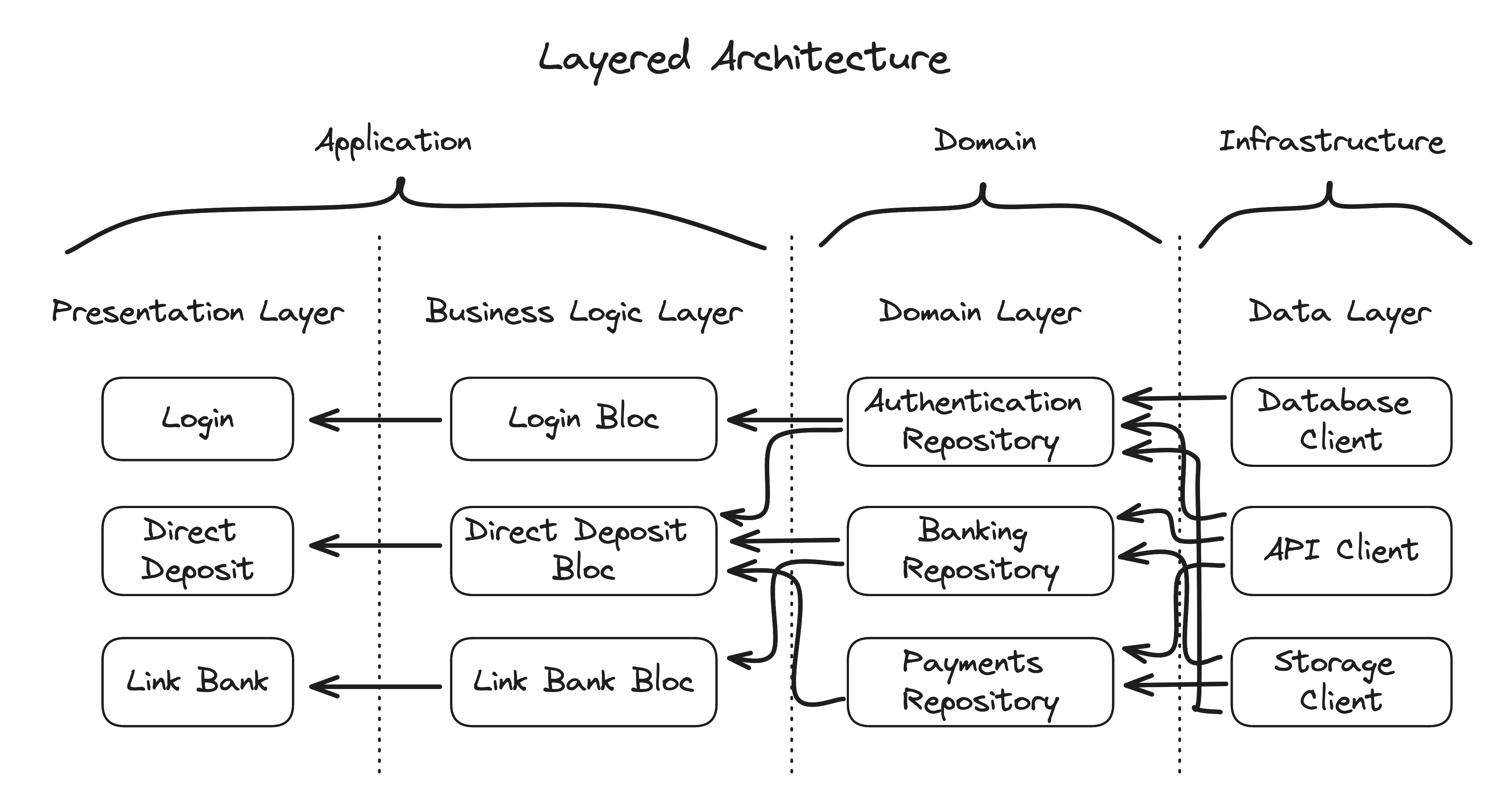 When using layered architecture, data should only flow from the bottom up, and a layer can only access the layer directly beneath it. For example, the LoginPage should never directly access the ApiClient, or the ApiClient should not be dependent on the UserRepository. With this approach, each layer has a specific responsibility and can be tested in isolation.