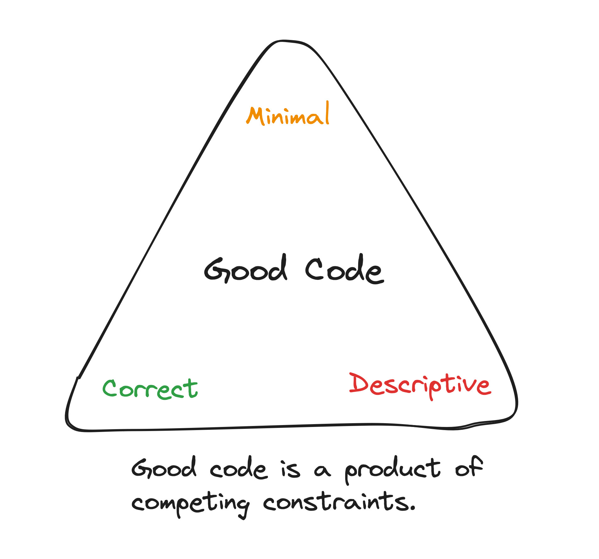 To reduce the likelihood of introducing errors, we want to create the least amount of readable code to perform the work by modeling the problem space correctly. Interestingly enough, “least amount of code,” “readable,” and “correct” are often at odds, forming a pair of bounding constraints for our definition of very good code.